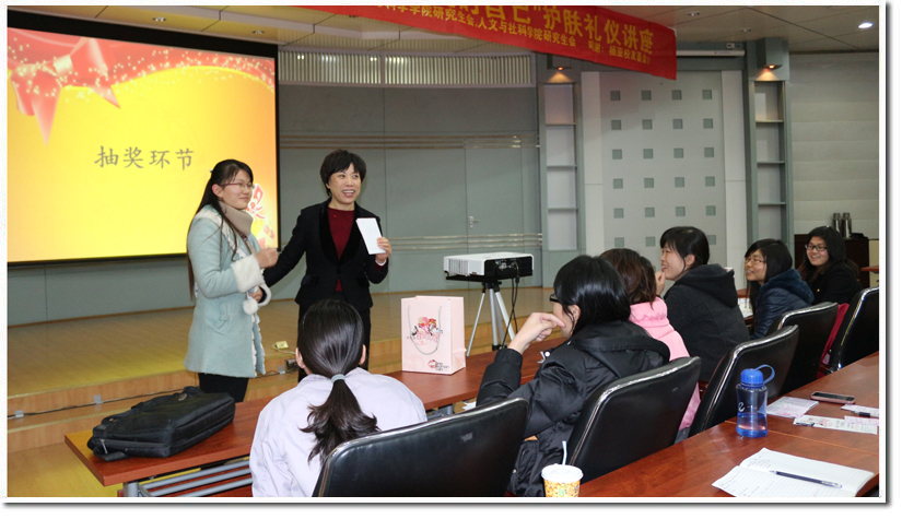 下午六点左右,同学们陆续的进入到活动现场,并且都收到了一份小巧的美丽咨询卡,可以在美丽咨询卡上填写个人信息及个人皮肤状况,然后交予工作人员放在抽奖箱内。下午六点半,活动准时开始。首先工作人员播放了有关社交礼仪的网络视频教程,视频主讲了初次会面时的要注意的细节,例如微笑、对他人的称呼、握手方式等,老师幽默风趣的语言表达方式逗得同学们哈哈大笑,也教会了同学们很多礼仪常识。