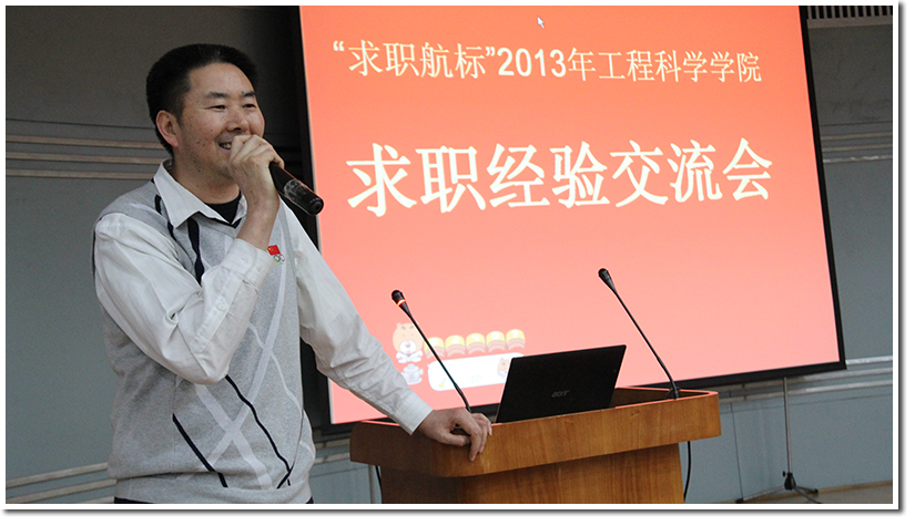 2013年4月19日晚18:30由校团委、校研究生会、招生就业处主办,工院分团委、工院研究生会承办,“所系结合”办公室协办的“求职航标”2013年工程科学学院求职经验交流会在西活二楼学术报告厅拉开帷幕。活动针对整天奔波于实验室和教室之间并对自己的职业生涯充满困惑的学生开展,同学们积极参与、热情高涨、现场十分火爆。到场的嘉宾有就业政策咨询与职业规划指导的郝心远老师、5系博士毕业生牛玉、9系硕士毕业生黄铭、9系本科毕业生陶玮玮、13系硕士毕业生朱会元、13系硕士毕业生周锦志。活动由项目组成员叶冬森主持。