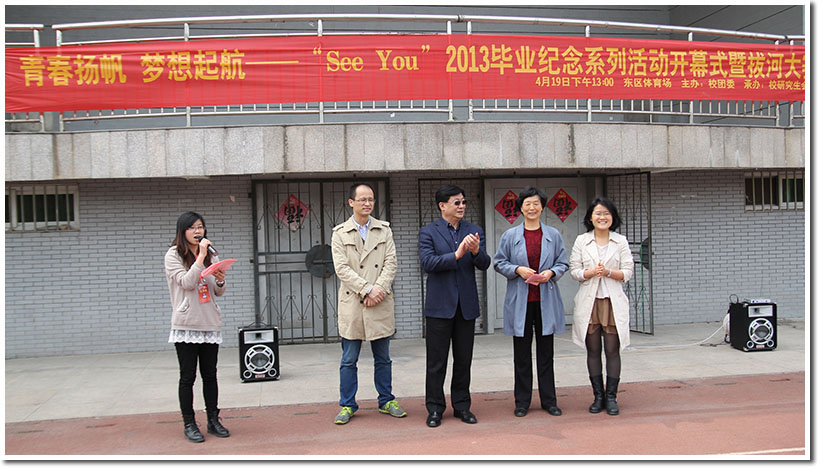 4月19日下午,“See You”2013毕业纪念系列活动开幕式暨拔河大赛在我校东区体育场精彩上演。2013届毕业生和2012级代培研究生29支队伍共计420余人参加了本次盛会。本次活动得到了学校各级领导的大力支持,校党委书记许武、校党委副书记鹿明、中国科大校友新创基金会刘志峰校友以及校团委副书记杨晓果老师出席了本次活动。