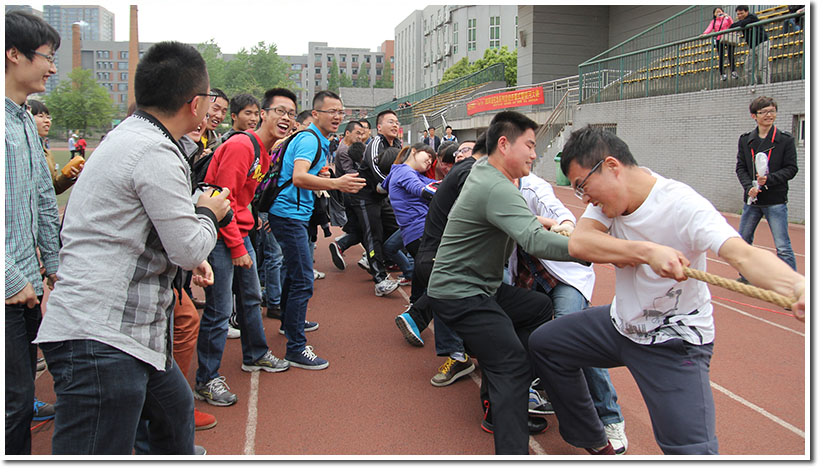 在参赛同学高涨的热情中,许武书记和鹿明老师分别为A、B两区的第一场比赛开哨,激烈的拔河大赛正式拉开帷幕。比赛中,加油声、呐喊声此起彼伏,现场气氛十分热烈。各队队员们应着“一二,一二”的加油声,齐心合力,毫不示弱。每个队伍都很好地展现了顽强拼搏、永不放弃的信念。