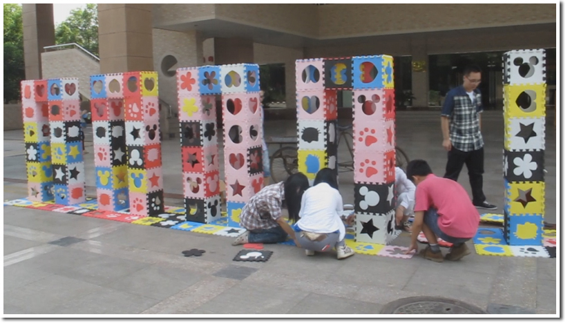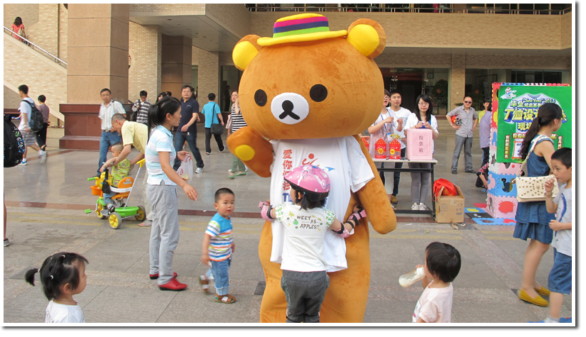 活动现场,项目组同学精心搭建爱心柱子,用来展示来自各个院系同学倾心设计的作品。同时,项目组开创性引入轻松熊活跃现场气氛增加此次活动的人气关注度。