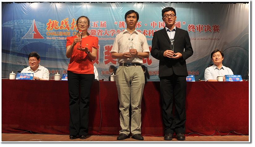 6月3日,第五届“挑战杯·中国联通”安徽省大学生课外学术科技作品竞赛在安徽师范大学落下帷幕,颁奖典礼于当天上午在安徽师范大学南校区礼堂举行。经过公开展示、分组答辩、专家评审等多个环节的激烈角逐,我校报送的六件参赛作品荣获四个特等奖和两个一等奖,并以团体总分第一名的好成绩一举摘得竞赛团体最高奖——“挑战杯”。此次获奖是我校第五次以最高分夺冠。安徽省政府副秘书长张武扬向我校团委副书记张平颁发了“挑战杯”。