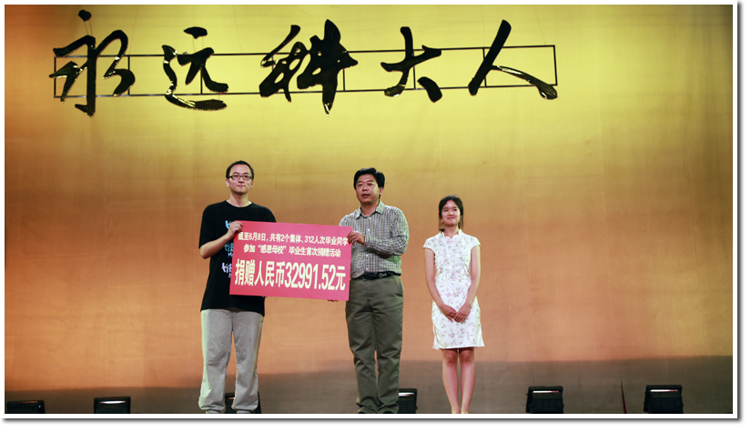 紧接着是第三篇章“Three idiots”,物理学院的舞蹈《咏春》展现了我校女生特有的风姿与柔美,魔术《魔手神彩》给大家带来神奇的魔术表演,现场观众时而屏气凝神瞪大了眼睛,时而爆发出雷鸣般的掌声;接着视频《毕业心声》让现场无数观众热泪盈眶;然后进行了毕业生首次捐募,朱东杰老师代表校教育基金会接受捐募。