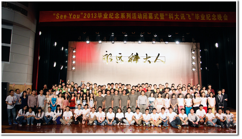 6月9日晚,主题为“永远科大人”的 “See You”2013毕业纪念系列活动闭幕式暨“科大讯飞”毕业纪念晚会在东区大礼堂隆重举行。校党委副书记鹿明老师、校友总会副会长兼秘书长朱东杰老师、学校各单位负责学生工作的老师、各院系团学工作负责老师等来到了晚会现场,与我校2013届毕业生共抒毕业情怀。