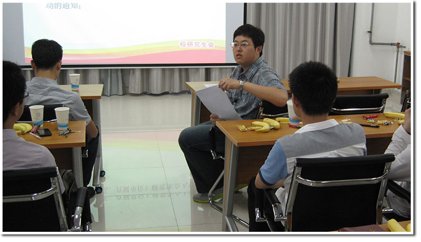 接着,校研会相关项目负责人介绍了目前重要项目的进展,马加强、沈旭和梁超分别详细介绍了“挑战杯”创业计划竞赛、“see you”毕业晚会和“seeyou”毕业系列项目的开展情况,主席屈直对活动进行了补充说明,肯定了项目组的工作,希望各院系主席动员同学们积极参与。屈直还介绍了校研究生会学期末内联,愿各院系研会主席也踊跃参与进来。