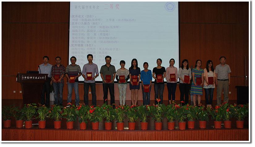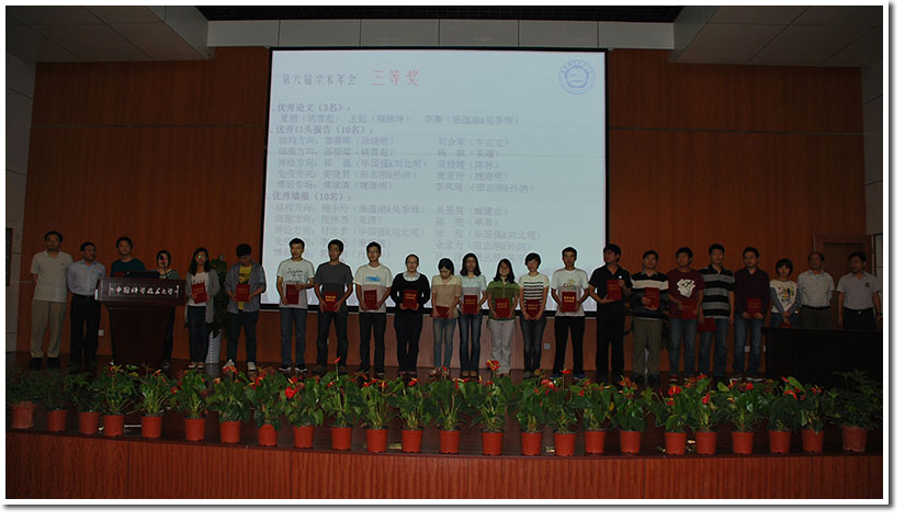 本届年会得到了学校相关领导老师的关心,张淑林副校长等到场指导工作。颁奖典礼在学院一楼礼堂举行,由周丛照教授主持,施蕴渝院士、胡兵 教授等分别为获奖者颁发奖励证书,全院400名研究生参与了颁奖典礼,整个会场座无虚席,还有近百名同学站在后面围观,现场气氛热烈。最终有63位同学分获优秀论文奖、优秀口头报告奖、优秀墙报奖及优秀墙报单项奖。