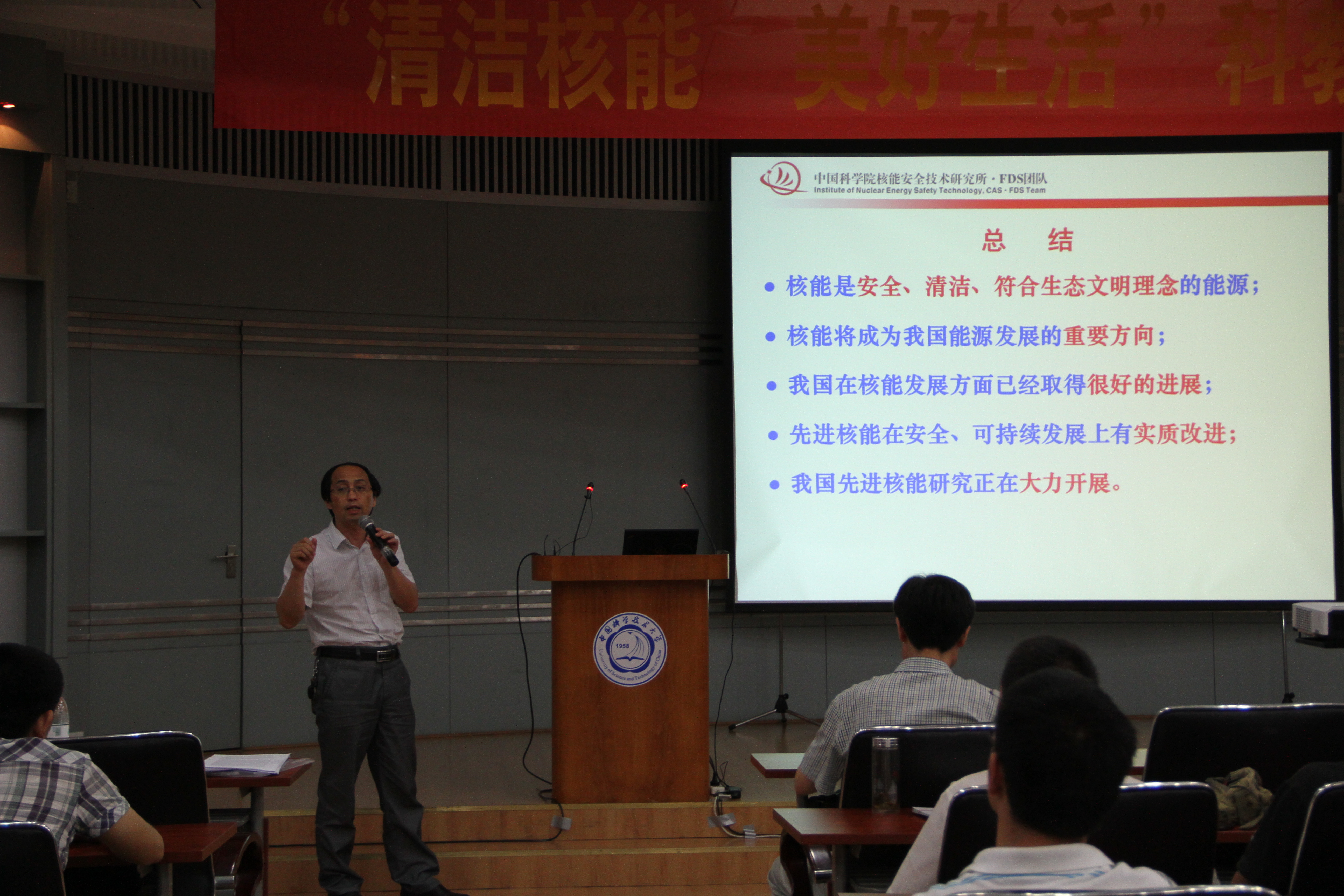 6月6日晚,由核科学技术学院、信息科学技术学院、化学与材料科学学院、计算机科学与技术学院和生命科学学院团总支联合举办的“清洁核能 • 美好生活”科教结合系列高级讲座在西区活动中心学术报告厅顺利举行。讲座邀请核能安全技术研究所赵柱民研究员主讲,赵老师主要围绕中国核能利用形势、核能知识和就业形式等方面进行了了详细的介绍和说明,讲座由核学院吴宜灿副院长主持。
