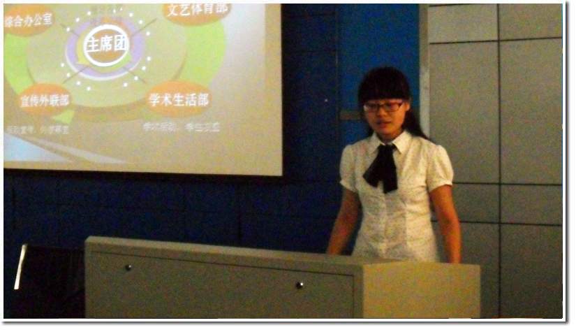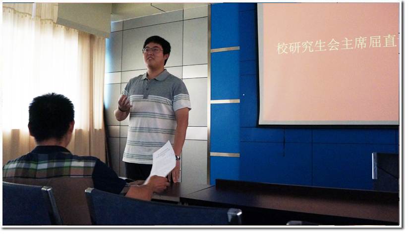 首先现任生命学院研究生会主席王立华对2012-2013年度生命学院研究生会的总结进行了总结,回顾了在过去一年里我院研会的组织发展、承办的丰富多彩的活动以及取得的优秀成绩,总结了目前研究生会组织架构及活动举办的现状,最后对研究生会未来的发展充满信心的说“莫道今年春将尽,明年春色倍还人”。