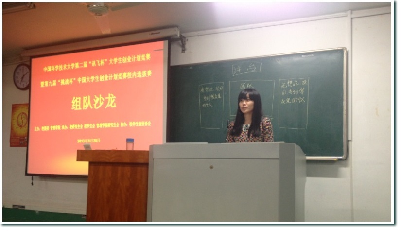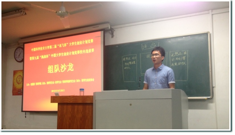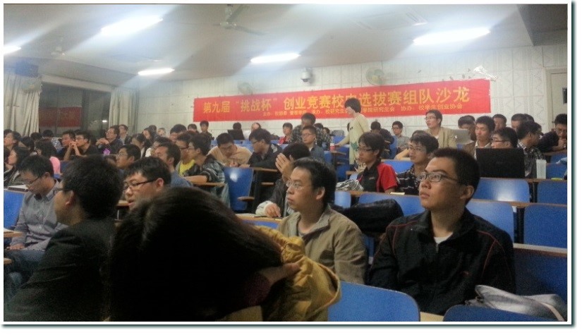 2013年9月25日19:00,第二届“讯飞杯”大学生创业计划竞赛第一次组队沙龙在东区2105教室顺利举行。个人、团体报名参赛者共100多人怀着极高的热情来到了沙龙现场,整个教室座无虚席,志同道合的创业者们热烈高涨。会议由项目组同学刘杰主持,整个沙龙包括赛程介绍、往届获奖选手经验分享、团队和个人现场展示、自由讨论四大部分。