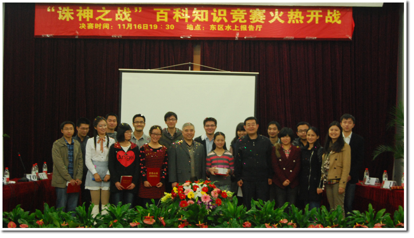 由火灾、核院、生院、微尺度、管院、人文六个院系联合举办的中国科学技术大学首届“诛神之战”校园百科知识竞赛决赛于11月16日晚7:30在东区水上报告厅精彩上演。六院的团委老师们和各院研会主席莅临决赛现场,核院党支书董赛老师为活动致开场词。