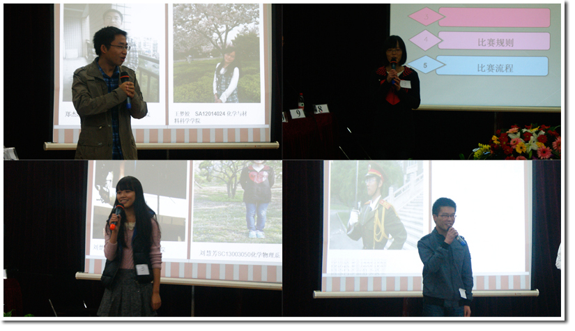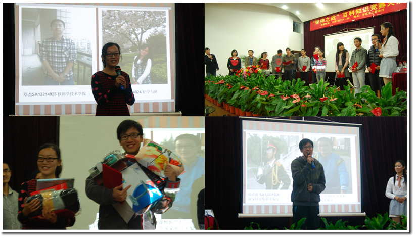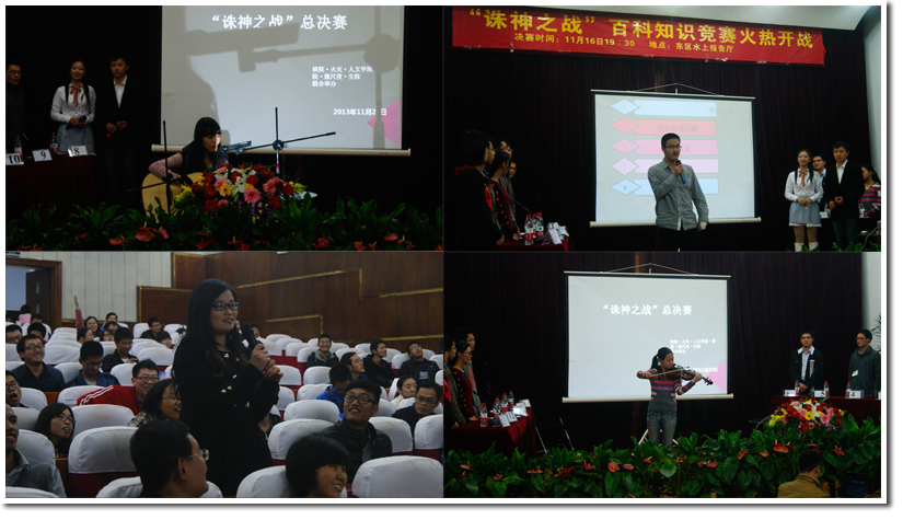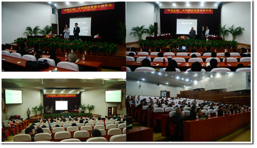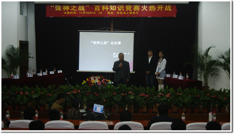 由火灾、核院、生院、微尺度、管院、人文六个院系联合举办的中国科学技术大学首届“诛神之战”校园百科知识竞赛决赛于11月16日晚7:30在东区水上报告厅精彩上演。六院的团委老师们和各院研会主席莅临决赛现场,核院党支书董赛老师为活动致开场词。