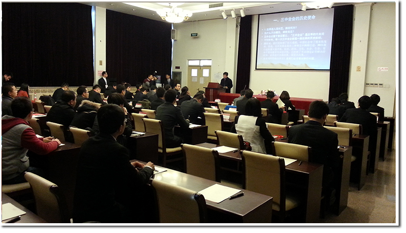 随后,由北京大学马克思主义学院党委书记孙熙国博士作《十八届三中全会精神与中华民族伟大复兴》的主题报告。报告就三中全会的历史使命以及全面深化改革的指导思想、总目标、基本原则、重大部署等方面做了详细的解读和深入的探讨。他指出,我们目前的时代任务和时代精神就是改革和创新,并特别强调了作为当代青年必须要有进取意识、机遇意识和责任意识。