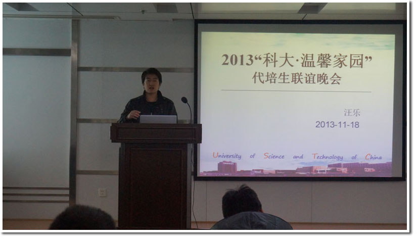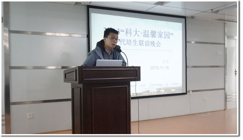 2013年11月18日晚6点30分,2013“科大·温馨家园”代培生联谊晚会项目组筹备会在近代物理楼210会议室举行。校研究生会副主席孟德超,跟进部长祝曹祥,以及项目负责人汪乐和胡肇焜出席了会议,会议由项目负责人汪乐主持。