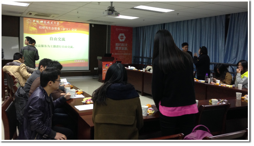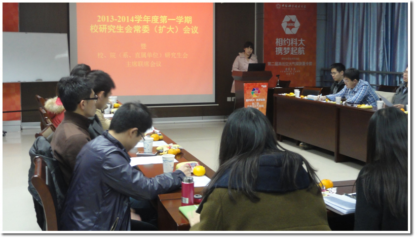 接下来,校研究生会相关人员介绍了目前正在筹备以及正在进行项目的相关情况。校研究生会综合办公室副主任廉鹏飞介绍了“团校骨干培训”项目的相关情况,并对各院系研究生会负责人一直以来的支持表示感谢。“委员提案”项目负责人钟锦红对目前委员提案工作的进展进行了总结,他认为本次提案无论在数量和质量上都较以往都有了较大的进步。2013中国科大权益信息平台负责人谢涛作了关于启动中国科大权益社区二期信息平台的通知,并希望得到各院系研究生会的大力支持,以期通过该平台更好地维护同学们的权益。“科技创新大‘汇’堂”项目负责人顾亚菲介绍了项目的整体策划方案,明确项目开展的时间点。