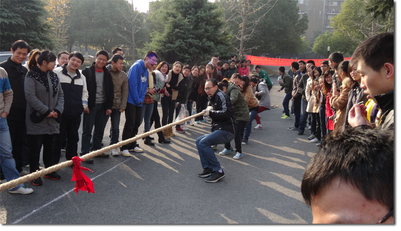 为保证本次比赛的公平性,比赛顺序抽签的方式确定,比赛场地用掷硬币的方式进行选择,采用单败淘汰规则,三局两胜决出胜负。上午9:00,比赛正式开始,17支队伍进行了激烈异常的角逐。拔河的双方选手都紧紧握着拔河绳,双脚紧紧地踏着地,身体向后压着;参赛队伍的导师在旁边出谋划策,拉拉队的同学也在旁边拼命地喊着口号,为比赛的队伍加油。比赛现场,欢呼声、呐喊声、口号声,层迭不穷。经过一上午激烈的角逐,产生了四强队伍,他们分别是施蕴渝教授实验室、胡兵教授实验室、魏海明教授实验室以及刘海燕教授实验室。