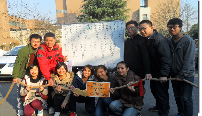 为保证本次比赛的公平性,比赛顺序抽签的方式确定,比赛场地用掷硬币的方式进行选择,采用单败淘汰规则,三局两胜决出胜负。上午9:00,比赛正式开始,17支队伍进行了激烈异常的角逐。拔河的双方选手都紧紧握着拔河绳,双脚紧紧地踏着地,身体向后压着;参赛队伍的导师在旁边出谋划策,拉拉队的同学也在旁边拼命地喊着口号,为比赛的队伍加油。比赛现场,欢呼声、呐喊声、口号声,层迭不穷。经过一上午激烈的角逐,产生了四强队伍,他们分别是施蕴渝教授实验室、胡兵教授实验室、魏海明教授实验室以及刘海燕教授实验室。