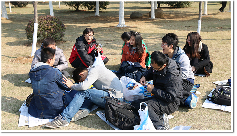 中午时分,大家在一块草地上休息。同学们把事先买好的饼干、面包、牛奶分发下去,大家在一起共同分享这些点心和零食。紧接着,大家也在一起玩了非常流行的游戏——谁是卧底,在游戏过程中大家不仅体会到了乐趣,还增添了相互间的信任和默契。