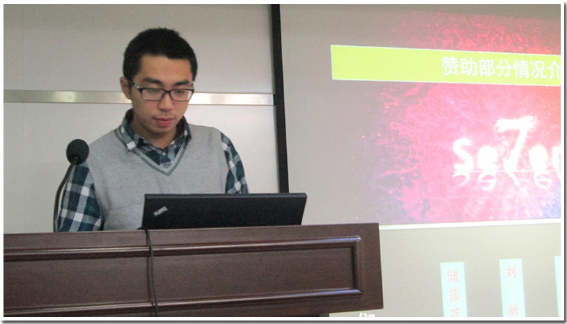 宣传赞助组副组长刘东阳对于目前拉赞助进展进行汇报,前期工作是在与策划组沟通后对项目进行初步预算,通过电话邮件方式联系部分商家,以及亲自与东西区附近的商家进行沟通联络,并向项目组成员分享了经验。