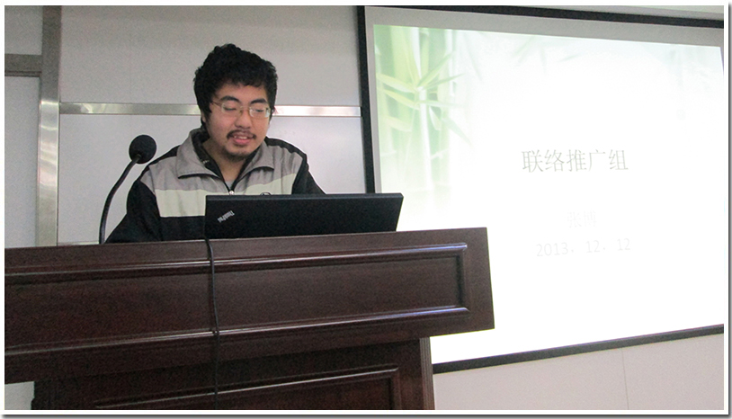 推广联络组组长张博发言,他说明了年历由实体版改成电子版的一些原因,并安排了联络推广的工作。推广联络组将负责现场投票以及与各单位联系进行电子版年历的推广。