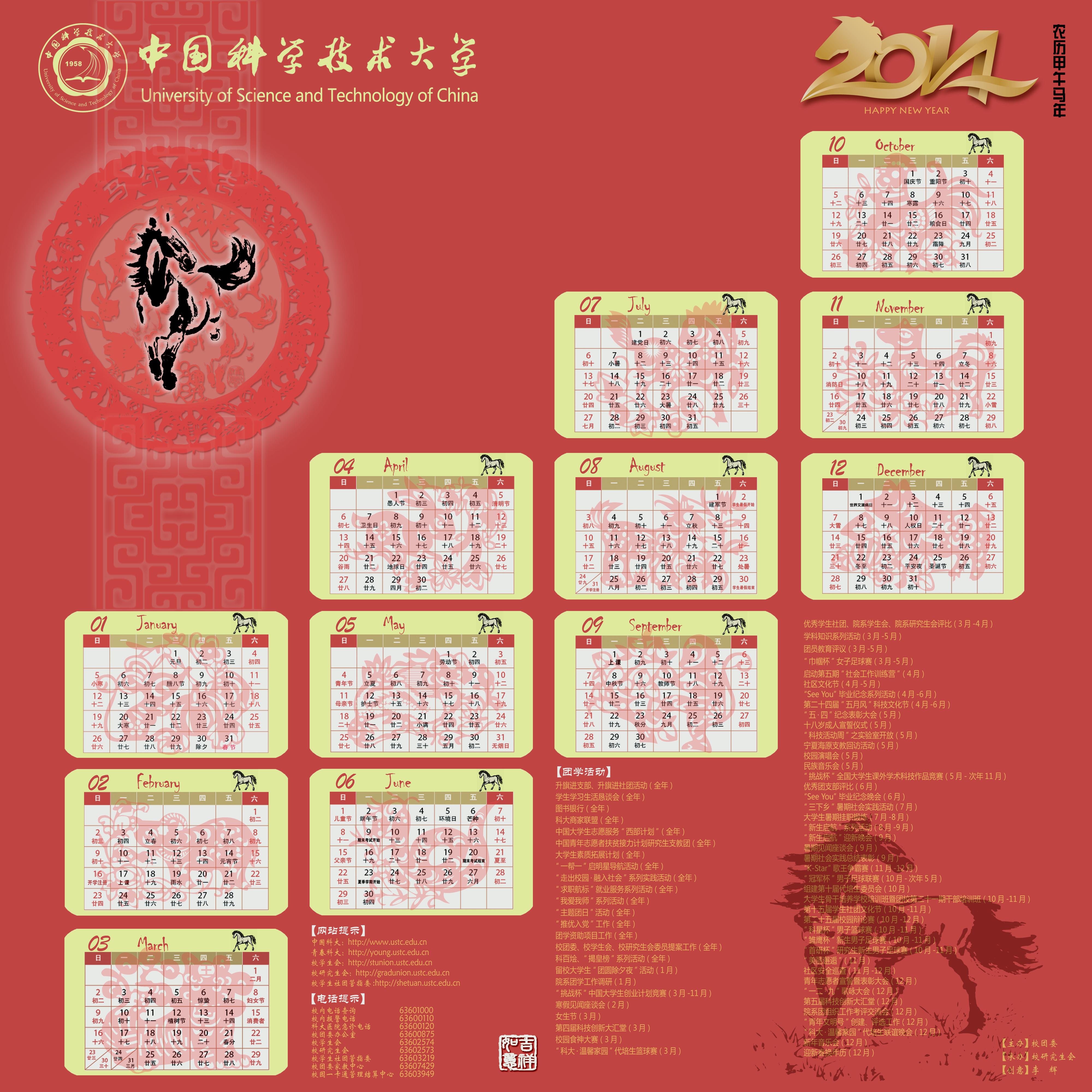 亲爱的老师们,同学们,校友们,2014甲午马年的中国科学技术大学个性化年历电子版新鲜出炉啦!