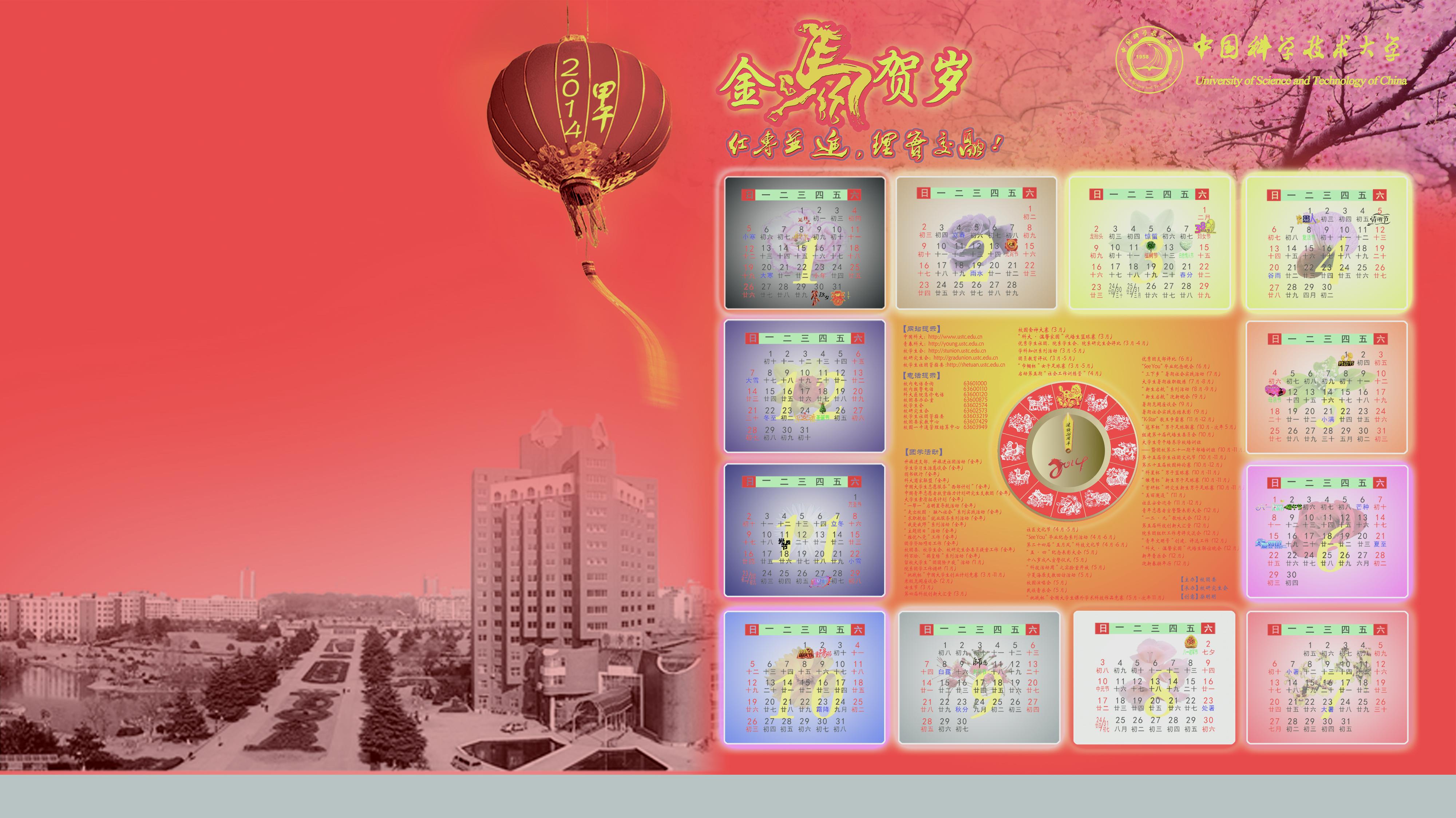 附件中放了一些常用分辨率的个性化年历电子版本可以供师生们下载使用,大家可以作为桌面背景,此外,在科大主页-公共服务-信息查询栏目也可以看到2014电子年历。