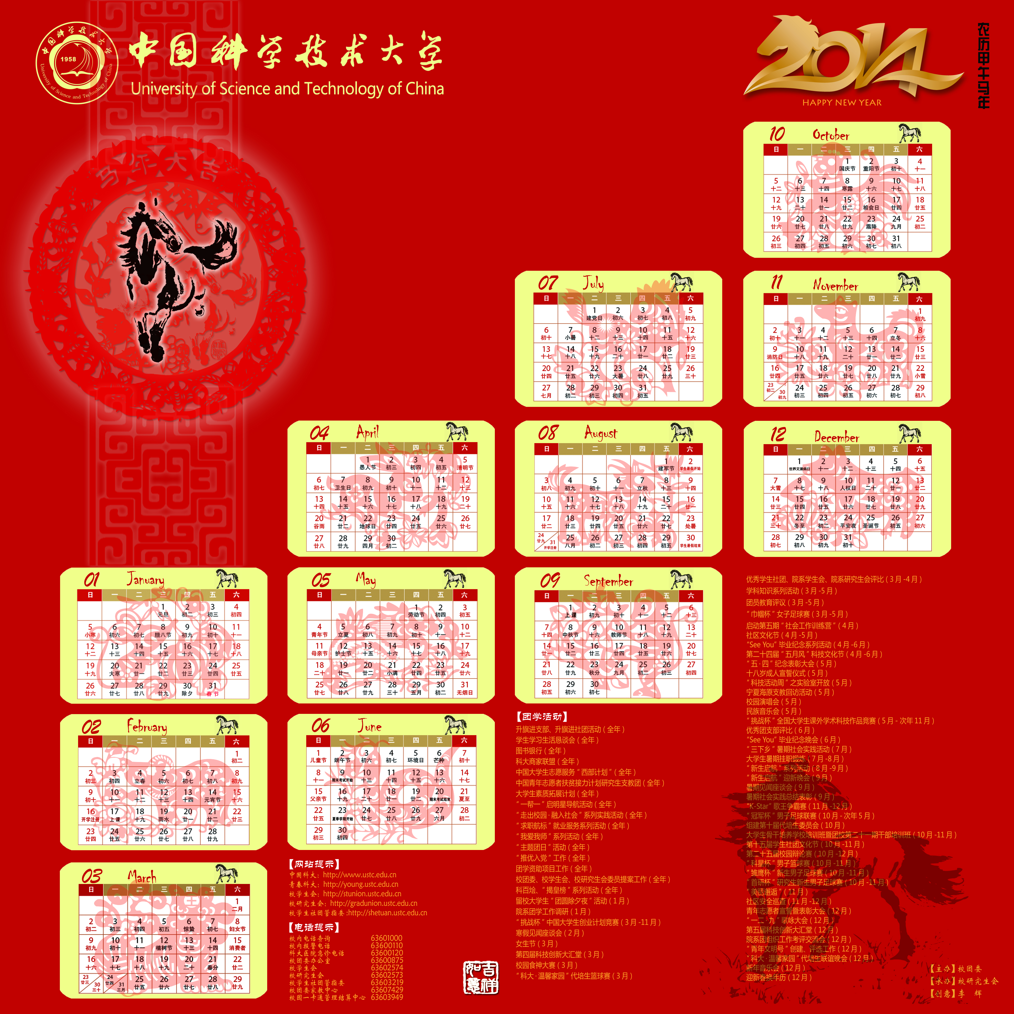 亲爱的老师们,同学们,校友们,2014甲午马年的中国科学技术大学个性化年历电子版新鲜出炉啦!