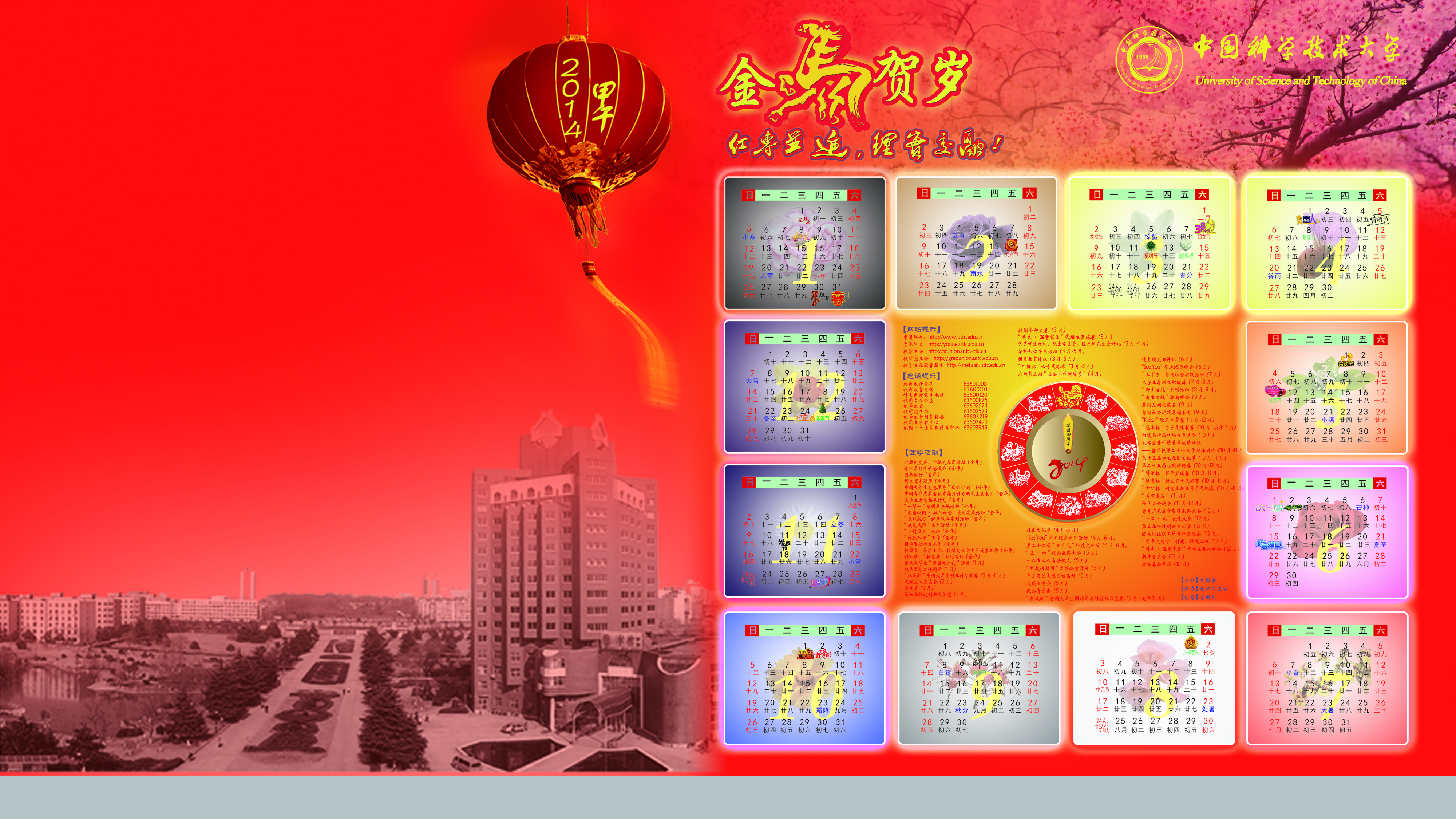 附件中放了一些常用分辨率的个性化年历电子版本可以供师生们下载使用,大家可以作为桌面背景,此外,在科大主页-公共服务-信息查询栏目也可以看到2014电子年历。