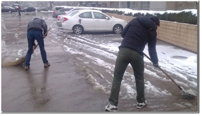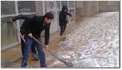 当时天空还下着小雪,气温很低,但同学们不畏困难,一个个热情高涨,都使出全身力气清除地面积雪。