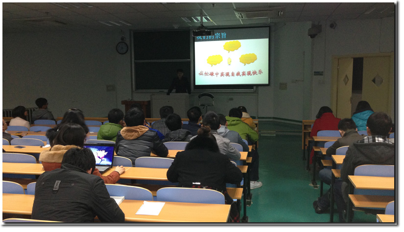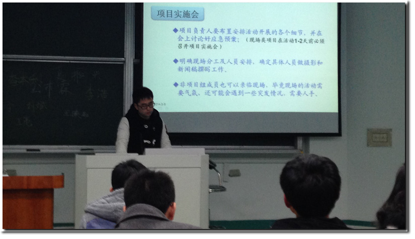 在以上环节结束之后,大会进入了模拟项目讨论的环节。在该环节中,新干部被分到不同的小组,每个小组大概5人。由主席团给定一个开放性的题目,各个小组针对该题目进行自由讨论。现场讨论中,每个人都非常热情、积极,尽情表达自己的观点。各个小组在内部讨论之后,到讲台上阐述本小组的讨论结果。在整个过程中,台上的新干部流利的阐述着自己的观点,台下的评委专心听讲并指出问题给出相应的建议。整个教室气氛非常活跃,迸发着思想的火花。