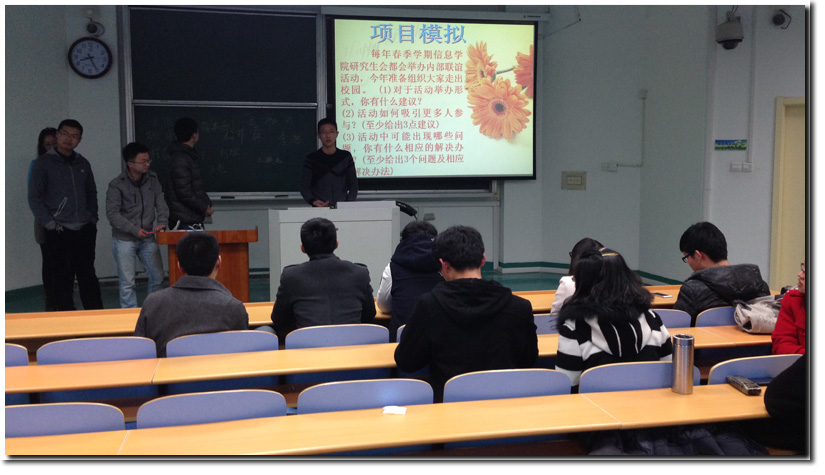 在以上环节结束之后,大会进入了模拟项目讨论的环节。在该环节中,新干部被分到不同的小组,每个小组大概5人。由主席团给定一个开放性的题目,各个小组针对该题目进行自由讨论。现场讨论中,每个人都非常热情、积极,尽情表达自己的观点。各个小组在内部讨论之后,到讲台上阐述本小组的讨论结果。在整个过程中,台上的新干部流利的阐述着自己的观点,台下的评委专心听讲并指出问题给出相应的建议。整个教室气氛非常活跃,迸发着思想的火花。