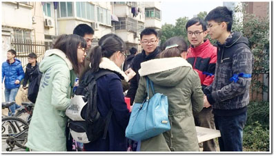 义卖活动在中午放学后正式举行,原本空荡的西活广场和研究生食堂门口很快聚集了大量师生。我们迅速开展行动,分发传单,进行“天使在人间”为主题的女性慈善宣传,并为他们介绍“春芽”日间照料站以及义卖活动具体内容。