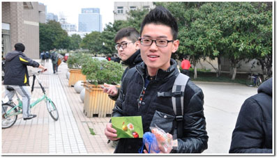 此次活动对男生提供帮送服务,若男生愿意多出一点爱心,我们将把礼物送往所指定的女生手中。很多男生对这个服务表示强烈的兴趣,直呼“有爱”。西活广场吸引了不少情侣参与其中,并进行了一次现场赠送。研究生食堂更是有不少学长将礼物送给实验室的师妹,对师妹表示了节日的祝福。