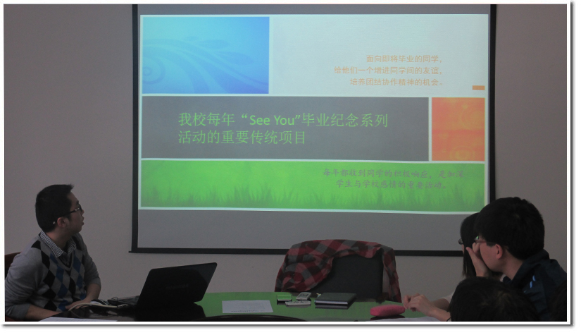2014年3月15日中午12点30分,“See You”毕业纪念系列活动开幕式暨拔河大赛项目筹备会在东区管理科研楼1018会议室顺利召开,项目跟进常委沈旭、项目负责人刘东阳以及全体项目组成员参加了本次会议,会议由项目负责人刘东阳主持。