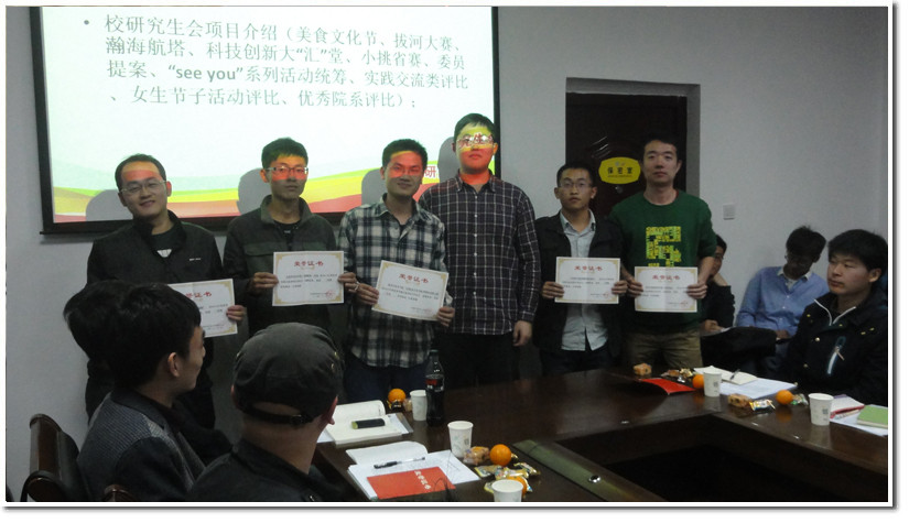 随后,会议对校研究生会2013年实践交流类评比进行了总结表彰。校研究生会主席屈直为获奖院系进行了颁奖,并鼓励所有院系研究生会在今后的活动中,能够保持干劲,再接再厉。