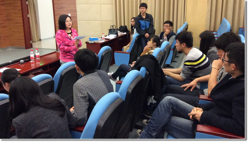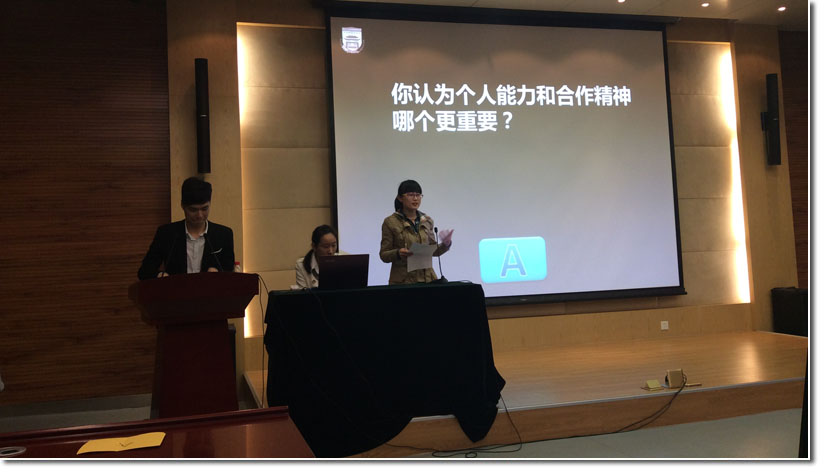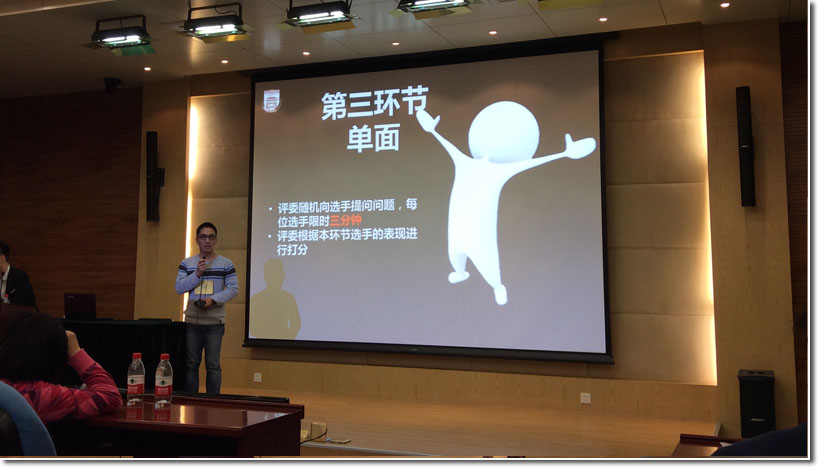 在自我展示环节,各位应聘者根据前期投放的简历对自己进行1分钟时间的自我介绍。值得一提的是,在活动进行中还踊跃出了现场投放简历的同学,激发了观众的热情。而且选手们的表现也丝毫不弱,比如张阳树同学,将自己在研究生期间从事过的科研工作,学生工作,个人经历和感悟等讲的头头是道,深深折服了现场的评委与观众。