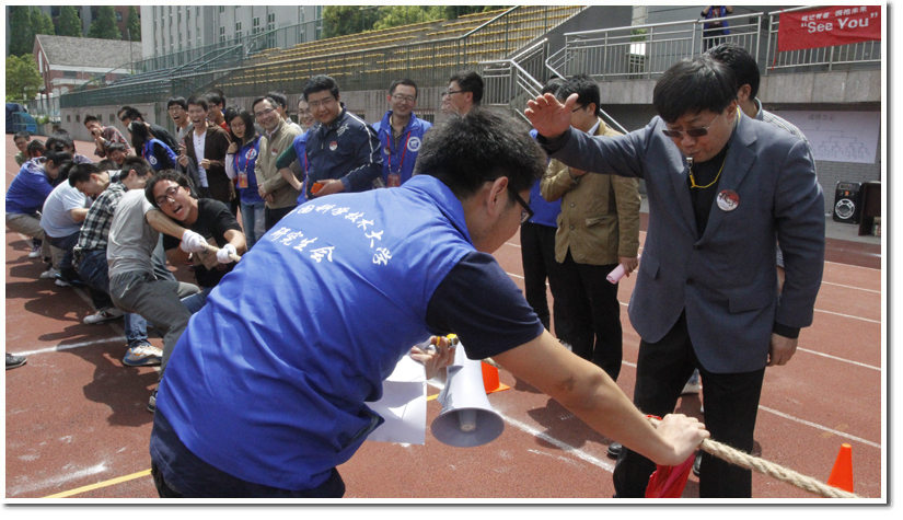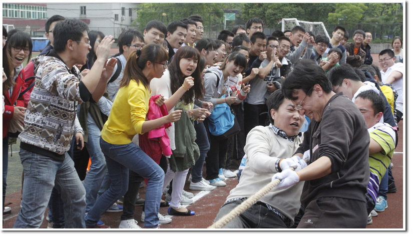 本次拔河大赛由于天气原因分两次进行,首先于25日下午举行预赛,30只参赛队伍进行激烈的比赛,决出4强,接着在28日的决赛中得到今年拔河大赛的冠军。受到同学们积极响应,包括2014届毕业生和2013级代培研究生共30支队伍420余人,携亲带友,共计约600名同学参加了本次盛会。