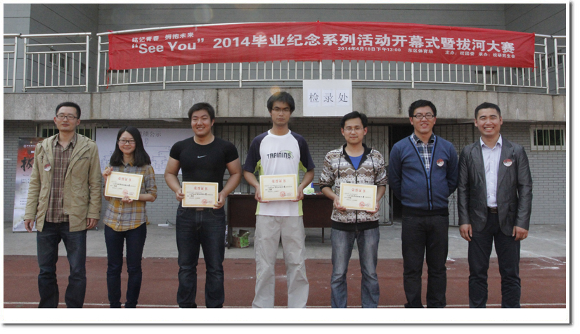值得一提的是,本次拔河比赛的子项目第一届“See You”2014毕业系列纪念活动三行诗大赛已经圆满落下帷幕,28日中午12点30分,三行诗大赛的获奖者也亲临了拔河比赛现场,领取项目组为他们准备的纪念品和证书,并为参赛者加油打气。