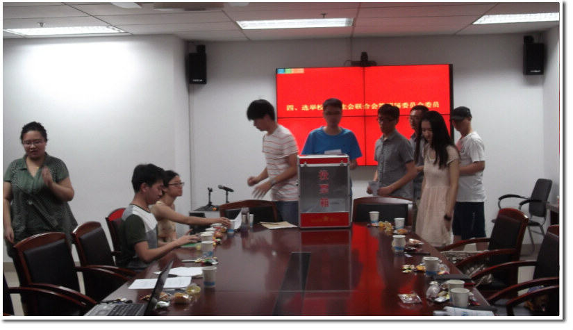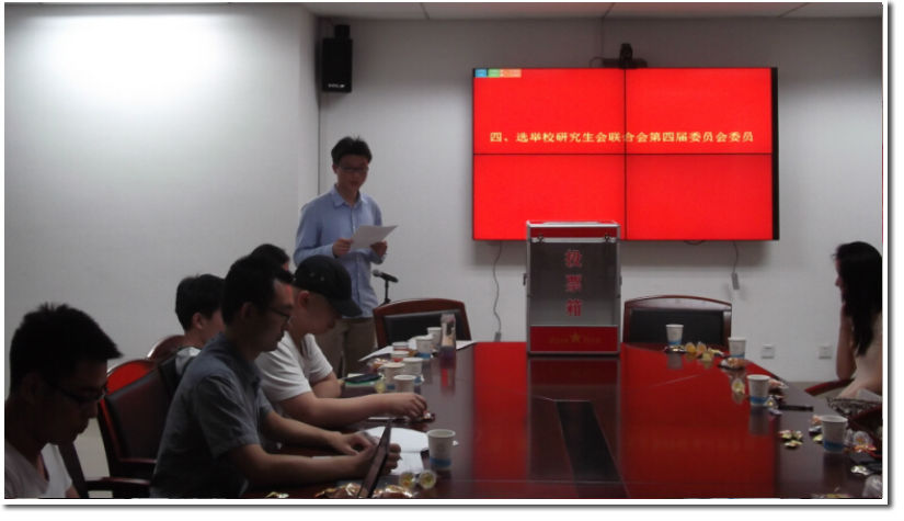 接下来,会议审议通过了审议通过校研究生联合会四届五次全委会增补常务委员选举办法,并以无记名投票的方式选举增补了熊伟、刘晏伯、谢涛、施矾等4位同学为校研究生联合会第四届委员会常务委员。