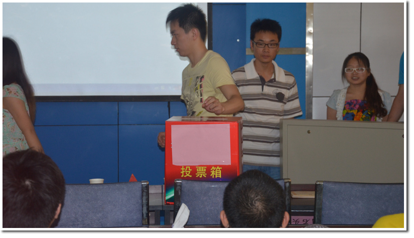 在总结完2013-2014学年我院研会的工作之后,进行了新一届主席团的换届选举。大会秉承公开、公平,公正的原则进行民主投票选举。选举通过蒋绪光同学任生命学院研究生会新一届主席,张洁、朱勇、陈明壮三位同学担任生命学院研究生会副主席。接下来蒋绪光及张洁,朱勇,陈明壮分别发表了任职感言。蒋绪光同学介绍了自己自加入在研究生会以来的感悟与收获,向学院老师和研究会对他的培养表达感谢,并表示努力将下一届生院研会做得更好。其他三位同学也纷纷介绍了自己在研究生会的履历及所组织参与的主要活动并表示会努力奉献,为研究生会的发展贡献自己的力量。