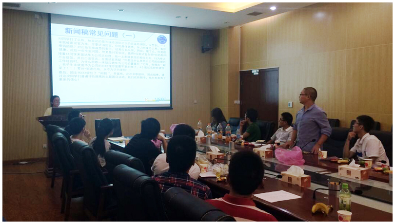 三、团学活动新闻稿写作与日常工作流程介绍。研会副主席庄异凡为研会新成员介绍了新闻稿件撰写要求与注意事项,并通过具体案例,与新成员积极互动,分析稿件常见问题,研会新成员收货颇丰。