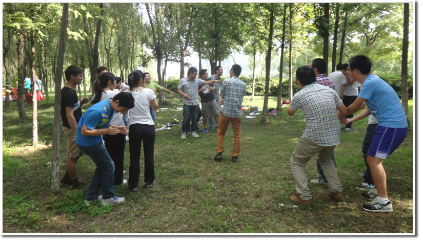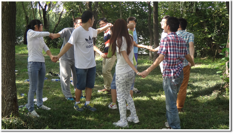相互熟悉后,同学们分组进行了“解手环”的素质拓展的游戏。在介绍完游戏规则后,在各位小组成员不懈努力下,大家由不知所措到后来很熟练地掌握了游戏技巧。成功解开手环后,同学们都感到了团队协作的重要性。