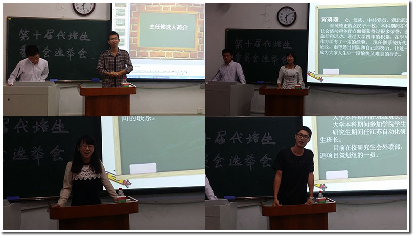 申报竞选主任委员的四位候选人程振东、黄璘璞、邢昕、赵俊普依次上台发表了竞选感言,说出了自己过去的组织、获奖经历,展现了各自的工作能力和参加竞选的信心,并对代委会的组织建设提出了自己的愿景,而且对今后活动的举办和丰富代培生生活给出了建设性的建议。
