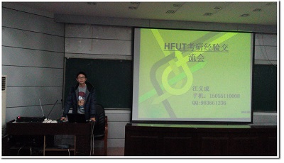 十一月九日下午,科大信息学院研究生会与合工大计算机与信息学院在合工大老区蟹兵楼联合举办了关于2014年考研保研经验交流会,旨在为合工大有意报考科大研究生的同学们提供更多的考研保研信息,促进同学们的学习热情和考研激情,增强同学们考研的信心和决心。总共有一百多名学生参加了此次交流会。参加本次演讲的四位同学今年均以优异的成绩考入科大,他们分别是科大信息学院的江义成、詹晨迪、薛军和朱唯鑫同学。