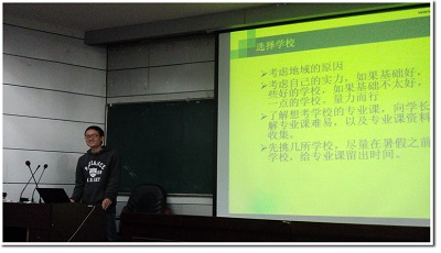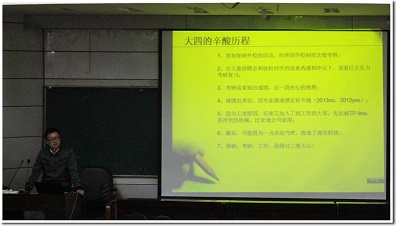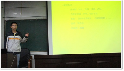 江义成同学主要讲述了三个方面:(1)考研前期要明确考研学校及专业方向;(2)考研过程中要分段复习,并强调了每一时间段的复习目的;(3)复试的主要内容以及面试联系导师等诸多细节。他还结合自身的经历给学弟学妹强调了寻找考研伙伴的重要性。