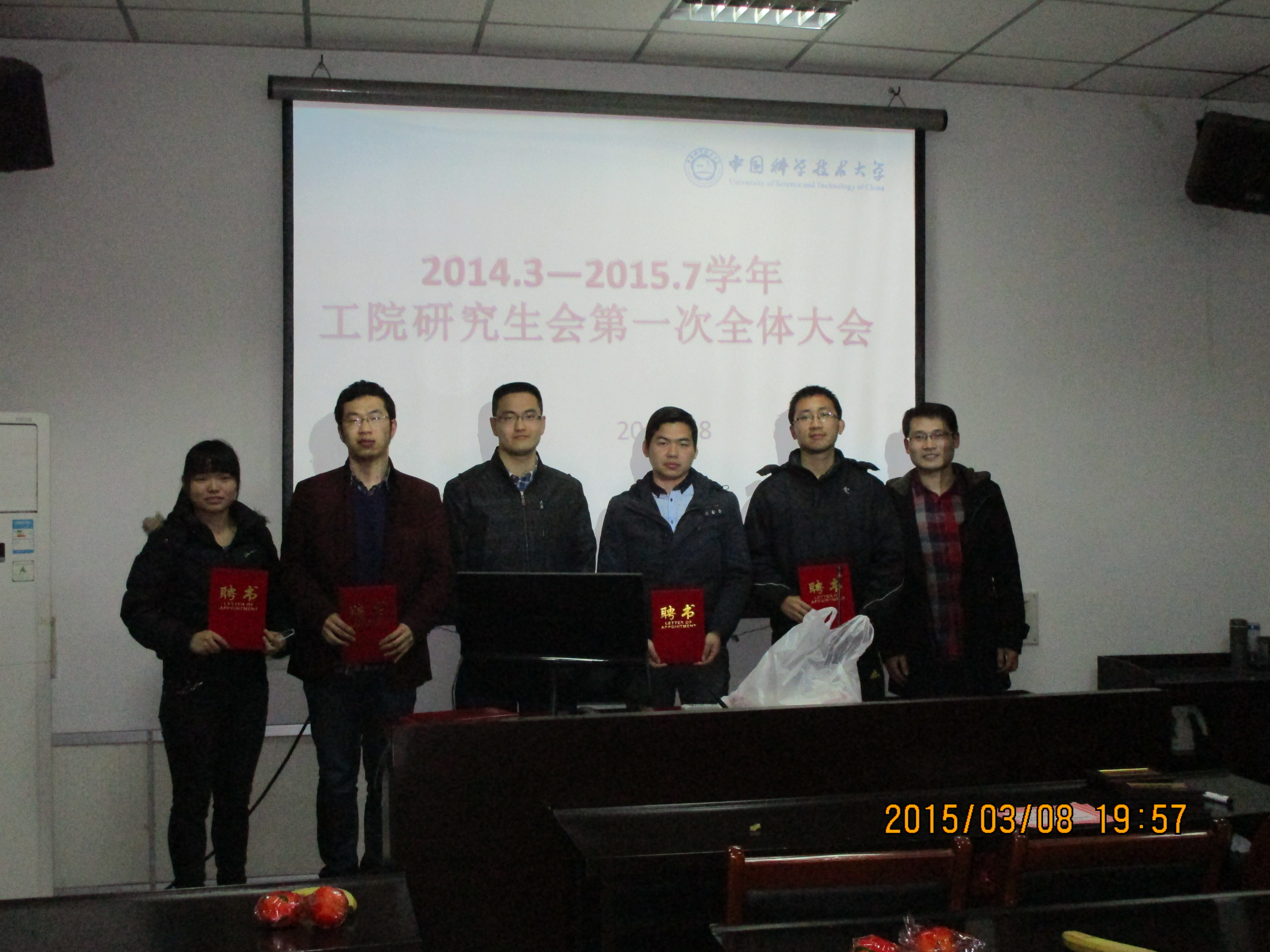 会上,金祝岭主席为表现优异的李念思、赵东升等5位优秀干部颁发工程学院研究生会的聘书。14届宣传部部长彭钰航为李念思、赵东升等5位优秀干部发了优秀干部标兵的荣誉证书。14届办公室主任为秦静、夏朝阳等9位优秀干部颁发了优秀干部的荣誉证书。