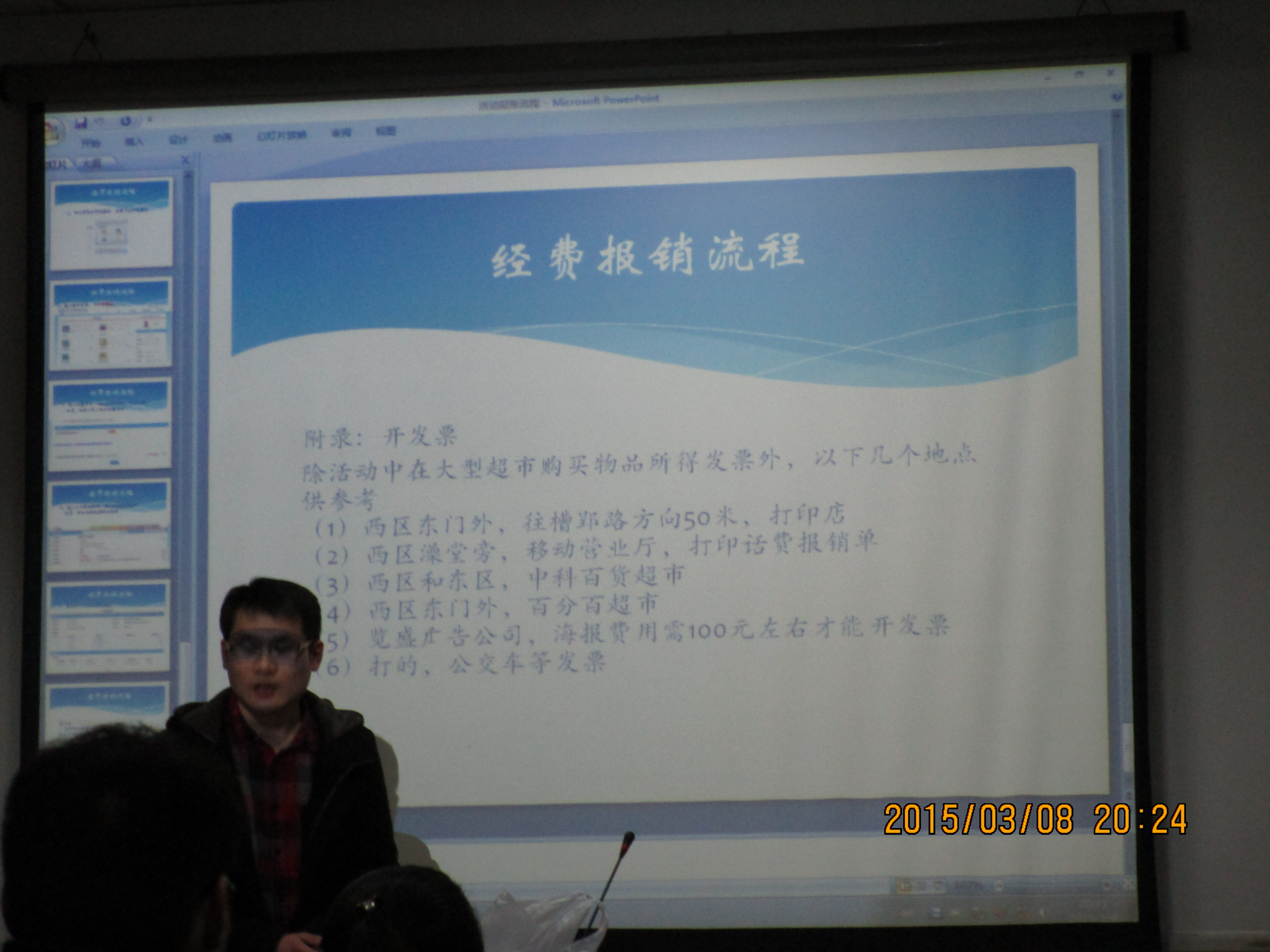 14届宣传部部长彭钰航应邀参加了本次会议,并对全体干事进行新闻稿宣传方面的技能培训。同时,金祝岭主席针对活动报账流程及活动策划等方面为与会干事进行了全面的技能培训,使大家对今后的研会工作有了更清晰的认识。