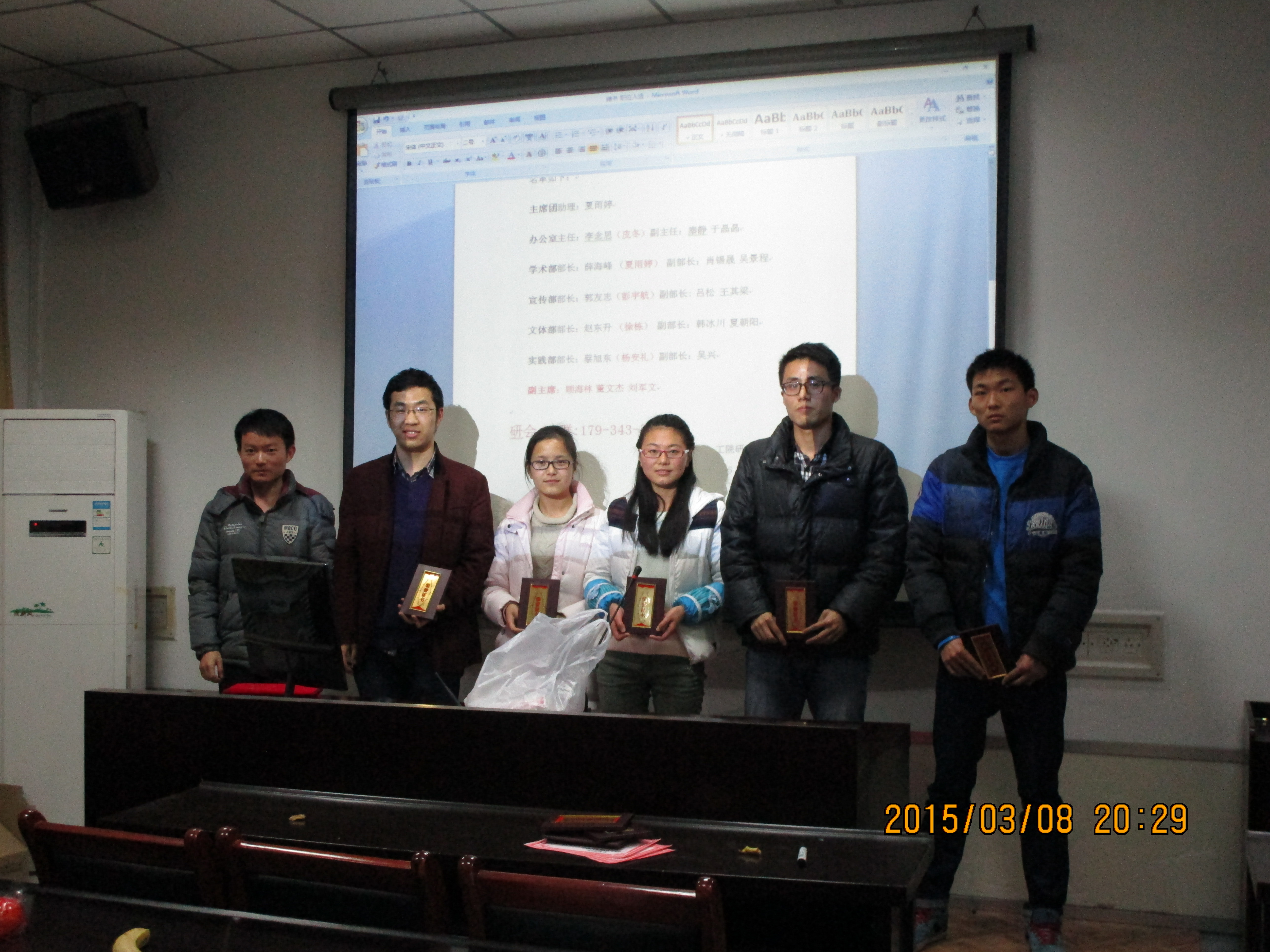 会上,金祝岭主席为表现优异的李念思、赵东升等5位优秀干部颁发工程学院研究生会的聘书。14届宣传部部长彭钰航为李念思、赵东升等5位优秀干部发了优秀干部标兵的荣誉证书。14届办公室主任为秦静、夏朝阳等9位优秀干部颁发了优秀干部的荣誉证书。