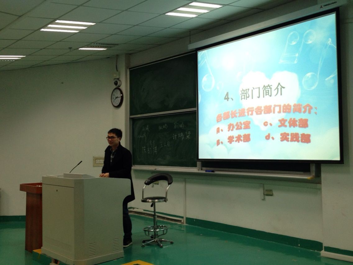 在3月15号晚上七点,研会隆重的举行了招新大会。首先是常务副主席王亮开场,然后是王云龙副主席讲话并进行干部培训,以及各部门的部长介绍相关部门情况。简单而又清晰的交流之后,新老成员又进一步增加了了解,更加清楚自己擅长的领域和职责。