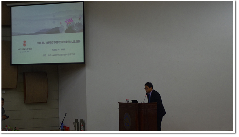 3月19日晚7点,由物理学院分团委主办的,物理学院研究生会、和君商学院七届合肥班承办的“求职航标——职业规划讲座”在东区水上报告厅顺利举行。本次邀请到了和君集团副总裁、和君商学院七届合肥班班主任林枫先生,为大家做主题为《大格局、新常态下人生选择》的报告。本报告为“物理学院2015求职航标系列活动”第一弹,许多慕名而来的科大学子以及和君商学院的同学纷纷过来聆听林枫先生的报告。