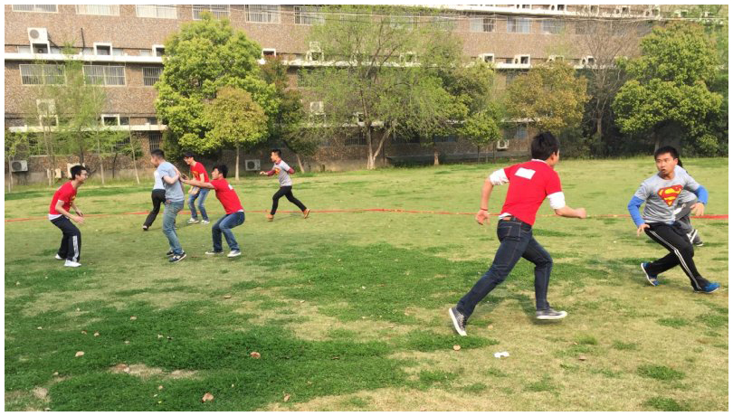 下午2点,运动会准时开始,几分钟内仍有不少同学受到这场运动会声势的影响,希望临时报名参加运动会,我们的工作人员王梦同学一一为其耐心登记。游戏的第一个项目是三人四足,每组派出三名组员相互协作,有些站在中间的同学在比赛中几乎都要飞起来了。接下来就是老少皆宜的套圈,每个小组都有十个圈,共有8组同学,分别抽签决定顺序,各路套圈高手纷纷出马拿下我们所摆设的零食,娃娃,杯子等等,大家玩得是不亦乐乎。第三项是运动会的传统项目:拔河,我们采取十人次比赛的规定,两女生算一个男生,最终李韩所带领的研二代表队,虽然女生居多,男生甚少,但是巾帼不让须眉,连下三城夺得总冠军,师姐们的战力在比赛中凸显得淋漓尽致。比赛第四项的“男生女生向前冲”给了许多情侣浪漫的好机会,男生背上自己的女朋友飞奔向前,自己或两人同喝下一瓶矿泉水后返回原点,虽然最后的冠军为实力战将杨康和范梦琳同学所得到,但是比赛过程中情侣们互相鼓励,点点温馨的场景依然是羡煞旁人。
